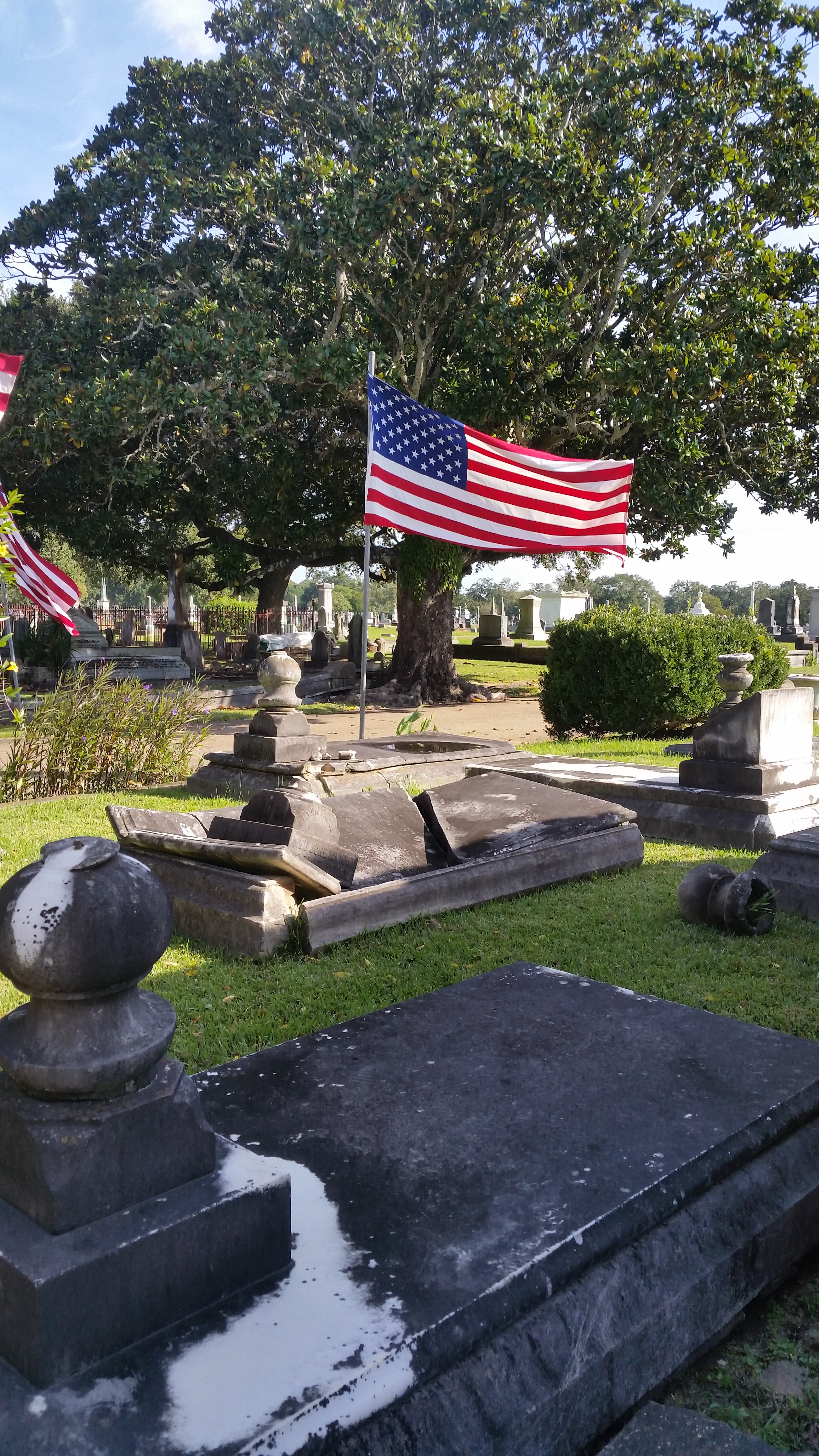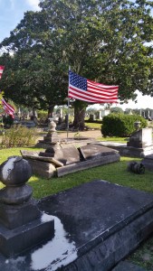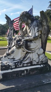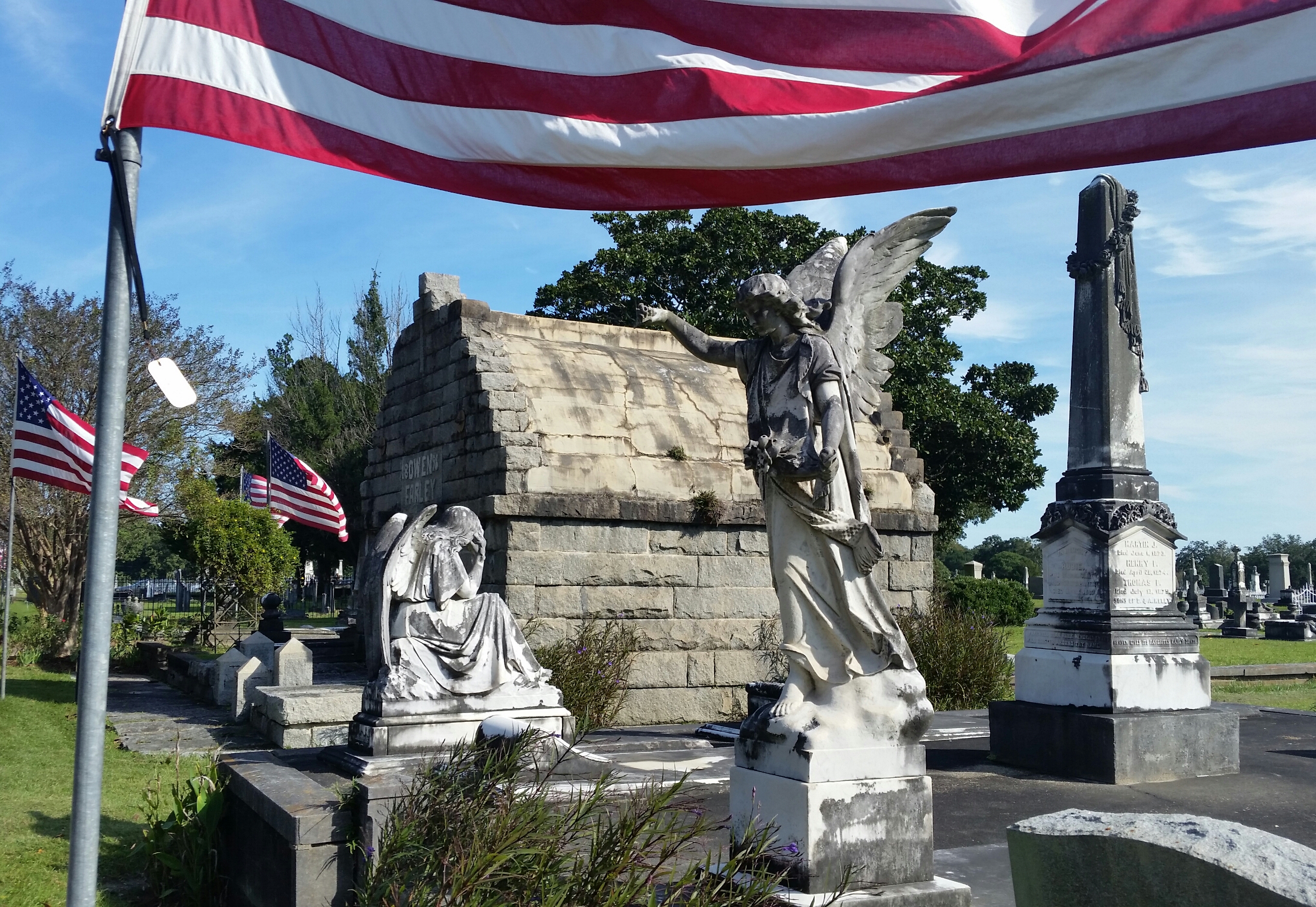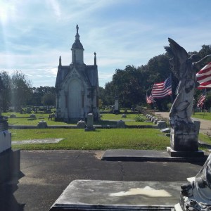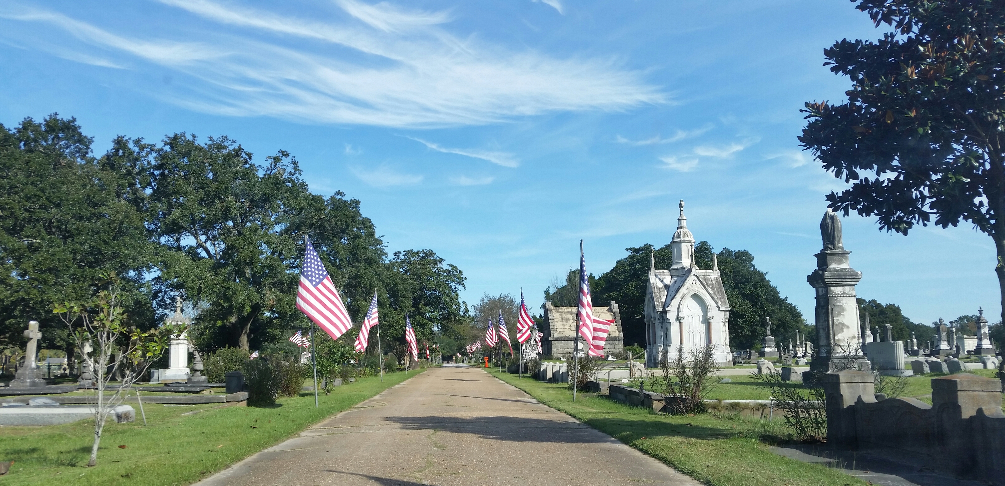On Saturday, I participated in a walking tour of historic Magnolia Cemetery here in Mobile, Alabama. I got to geek out over local history in the fourth oldest (and the largest) municipal cemetery, established in 1836. People of all faiths and walks of life rest here, including plenty of noteworthy historical figures. And as it was Veteran’s Day Week, 105 casket flags from service members from thirty states flew over the Avenue of Heroes—a lovely sight on the blustery autumn morning. Here’s a sampling of photographs.