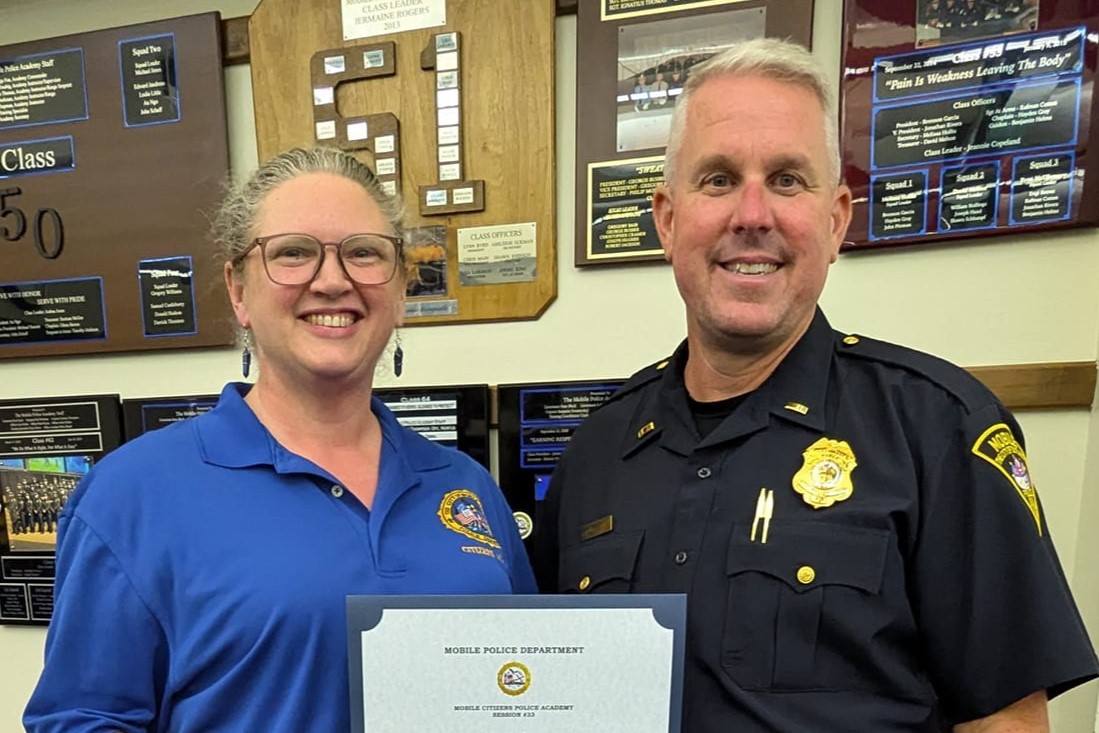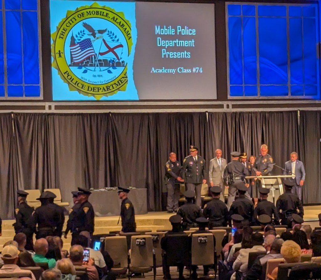 In other news, after ten weeks of classes, plus patrol ride alongs and field trips, I graduated the Mobile Police Department’s Citizens Police Academy. Here’s a picture of me with Lt. Congleton, who ran the academies for both the citizens and the MPD recruits. He answered a lot of my questions over the weeks in class.