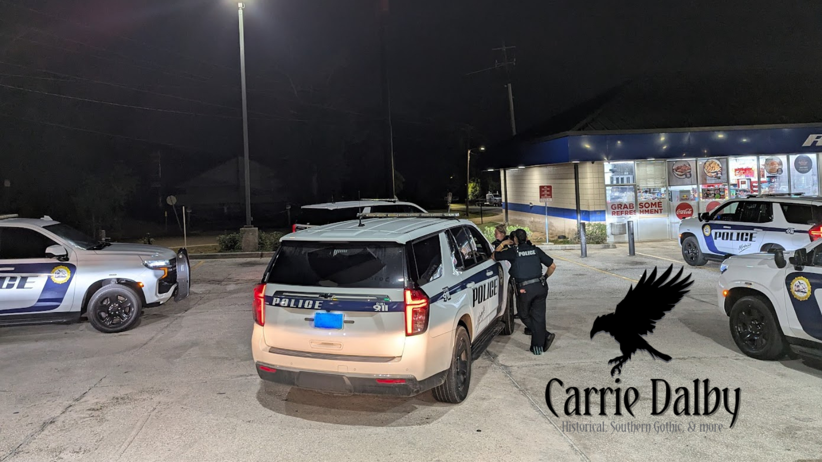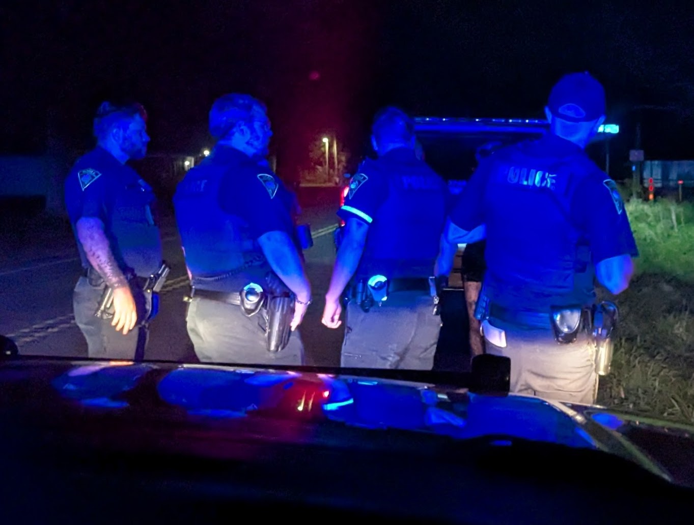 I never got to see the K-9 unit in action, but it was interesting to hear the chatter over the radio and be part of a perimeter for the first time. Once we were released from the perimeter duty, it was back to town for a brief patrol until we were sent towards Theodore for a welfare check call. After midnight, we joined a host of officers at the location of the stabbing. Officer Crespo got the latest news from the others who had been on the scene while he was assisting the carjacking search.