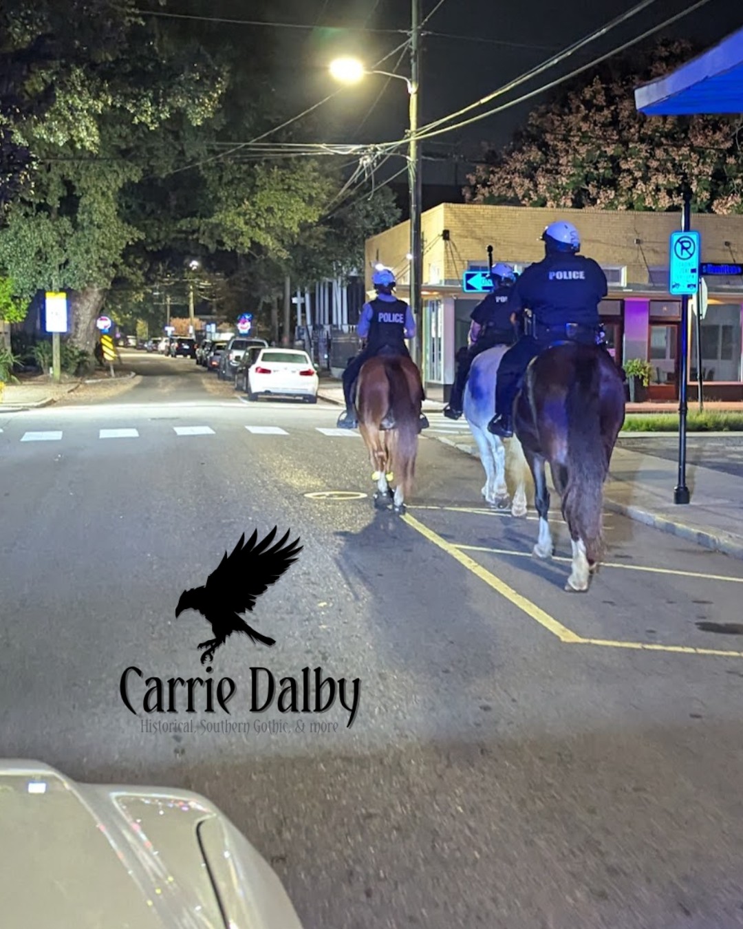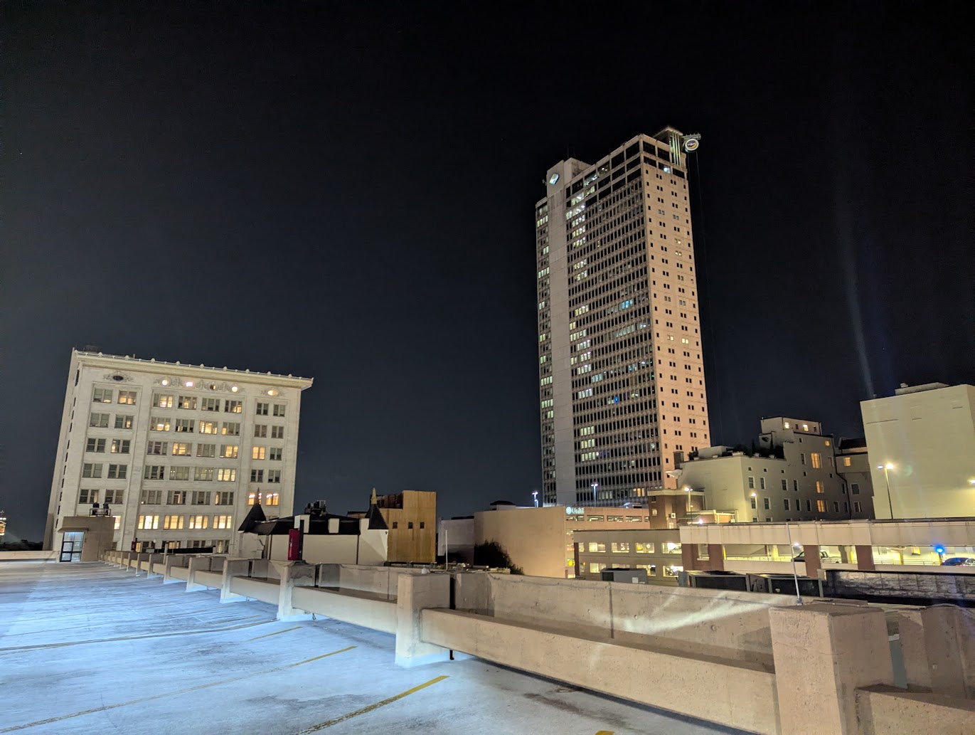 While the sergeant and others—including the extra officers from different precincts working overtime—kept sharp eyes on the entertainment district, my hosting officer was part of the perimeter patrol. From Broad to Water Streets and Beauregard to Canal, our unit patrolled the streets, parking lots, and parking garages. Parking garages were a first for me on patrol with MPD. We went up to the top level of several garages in the area, both on call (reports of motorcycles racing on the top deck) and for regular patrol. In a small garage, the officer was thanked by a resident from an adjacent building, saying he appreciated MPD patrolling it. The larger garages offered river views and great vantage points of historic architecture, like the Van Antwerp building.