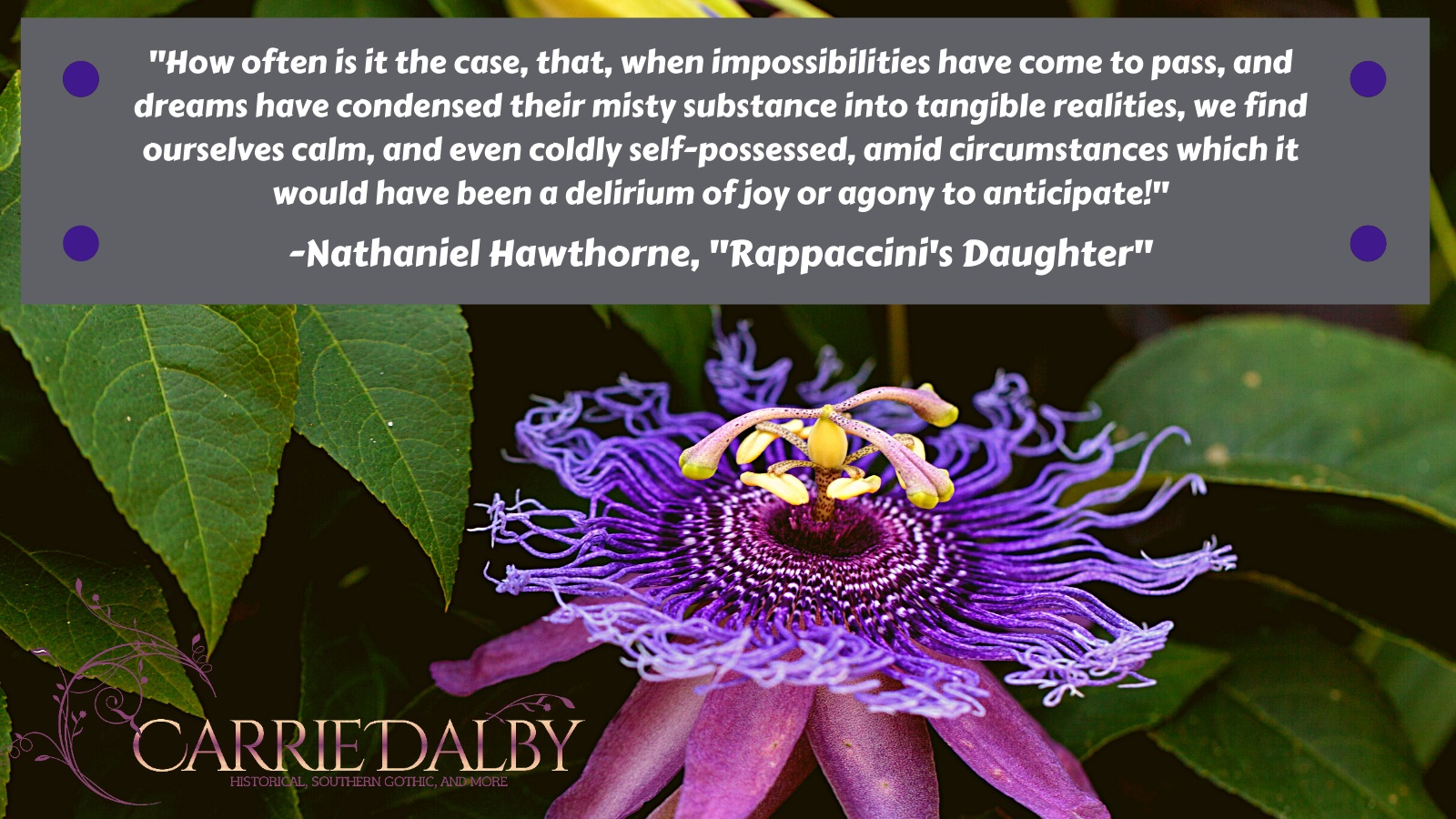 Carrie’s newest short is a retelling of Nathaniel Hawthorne’s short story “Rappaccini’s Daughter” and it’s included in Masked Flaws and Other Stories and Classic Pieces Retold. Enjoy “Hawthorne’s Daughter”, Carrie’s first foray into a retelling. Yes, she gave it a historical Southern Gothic slant in turn-of-the-century Mobile.