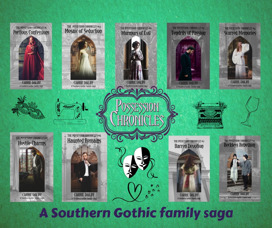 The Possession Chronicles is a historical Southern Gothic family saga series for adults with eight main novels, as well as a novella (#1.5) and several short tie-in stories. The series is complete! As of October 2022, the second editions of the books are available from most major booksellers/apps–in paperback and on digital platforms. These new editions include bonus short stories that were previously only available in anthology collections and one never before released short. Carrie recommends readers be sixteen or older before diving into The Possession Chronicles.